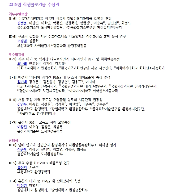¿ÀÀü¿¡ ÁøÇàµÇ¾ú´ø ÇлýÄÝ·ÎŰ¿ò¿¡¼´Â Çѱ¹¿Ü±¹¾î´ëÇб³¸¦ ºñ·ÔÇÑ 12°³ ´ëÇб³µéÀÇ ´ëÇпø ÇлýµéÀÌ Âü°¡ÇÏ¿© ¹Ì¼¼¸ÕÁöÀÇ ÈÇÐÁ¶¼º ¹× ¹ß»ý Ư¼º, VOCsµî ´Ù¾çÇÑ ´ë±â¿À¿°¹°Áúµé¿¡ ´ëÇÑ ¹ß»ý¿ø Ư¼º ¹× °ü¸® ¹æ¾È µî ÃÑ 26ÆíÀÇ ´Ù¾çÇÑ ¿¬±¸°á°úµéÀ» ¹ßÇ¥ÇÏ¿´½À´Ï´Ù. ¶ÇÇÑ, À̹ø ÇлýÄÝ·ÎŰ¿ò Çà»ç¿¡¼´Â ÇлýµéÀÇ ´ë±âȯ°æºÐ¾ß ¿¬±¸¿¡ ´ëÇÑ °ü½É°ú ¿Á¤À» ºÏµ¸¿ì±â À§ÇÏ¿© ÃÖ¿ì¼ö»ó 2¸íÀ» ºñ·ÔÇÑ, ¿ì¼ö»ó 4¸í°ú Àå·Á»ó 3¸íÀ» ¼±Á¤ÇÏ¿´½À´Ï´Ù. ÃÖ¿ì¼ö»ó 2¸íÀº 2019³â ÀϺ» ´ë±âȯ°æÇÐȸ¿¡ Âü¼®ÇÏ¿© ¹ßÇ¥ÇÒ ¼ö ÀÖ´Â ±âȸ¸¦ Á¦°øÇϰí, ¿ì¼ö»ó°ú Àå·Á»ó¿¡´Â ÇлýµéÀÌ ¼±È£ÇÏ´Â »óǰµéÀ» 2019³â Á¤±âÇмú´ëȸÀÇ Á¤±âÃÑȸ¿¡¼ Á¦°øÇÒ ¿¹Á¤ÀÔ´Ï´Ù.